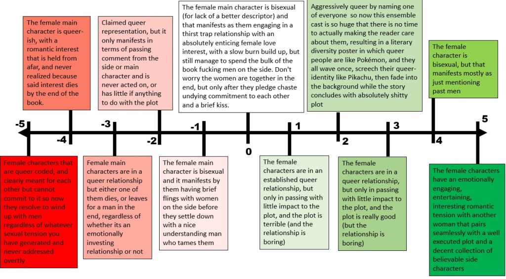 But if this series of blog posts has had anything to prove, its that it has been incredibly hard to find this genre without the science fiction being trash, or the lesbians being barely part of the plot. I have been frustrated. I made excel sheets and radar plots to better quantify my frustration. Guys, I designed my own ranking (Rozkillis Ranking will NOT be seeing a blog post, I was mad when I wrote that, I have since eaten a fruit, and feel much better about things). I’ll show you the ranking though: